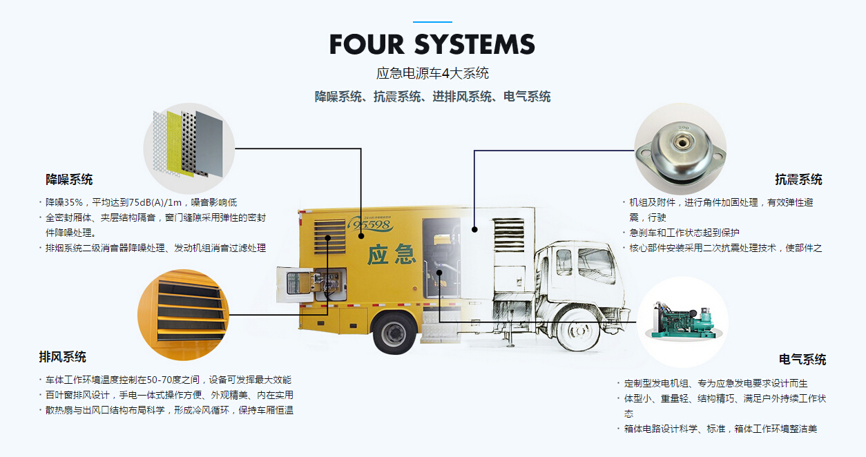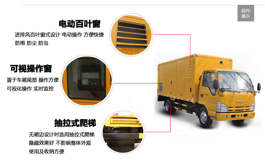 移動電源車由二類汽車底盤,靜音廂體,柴油發(fā)動機,發(fā)電機組,控制系統(tǒng),內(nèi)外照明裝置,輸配電裝置,電纜卷盤,電源輸入,輸出接口,液壓支腿等構(gòu)成。