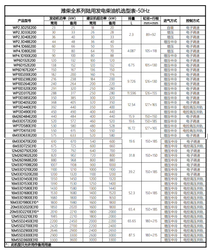 濰柴發電機(濰柴動力)系列選型表